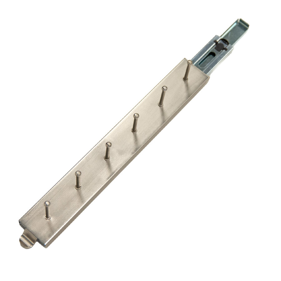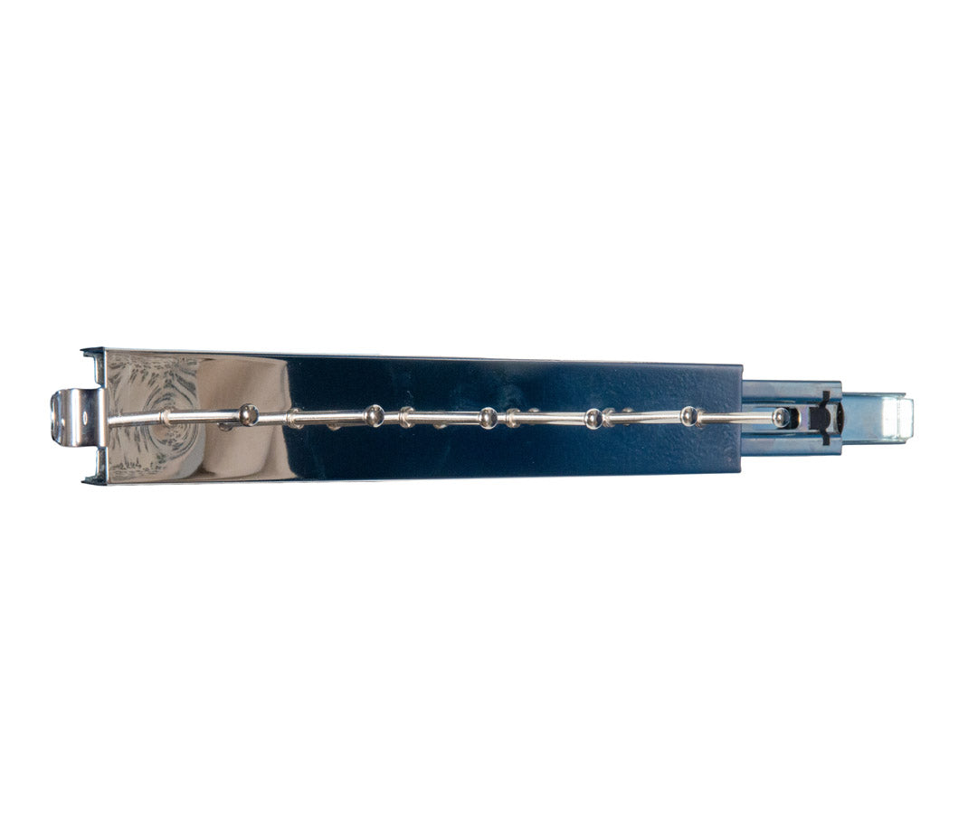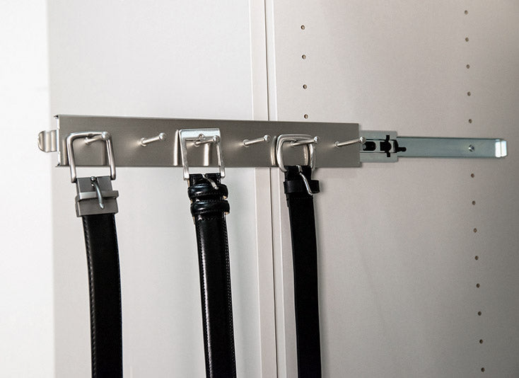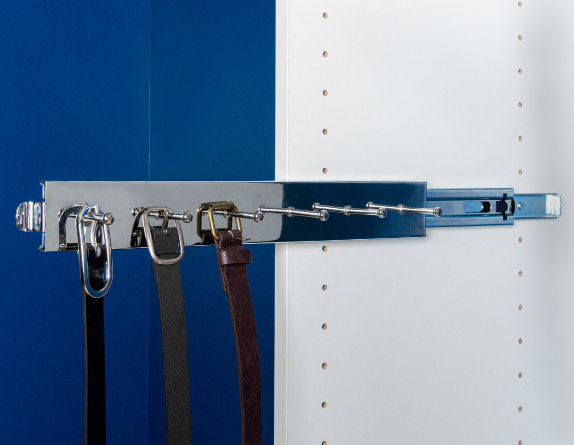 Keep your belts neatly organized an easily accessible with the Chrome Sliding Belt Rack. This durable belt organizer features six large hooks which can easily hold all of your belts and smoothly slides out from your closet wall so that you can easily choose from the perfect belt to match your attire. Constructed of durable chrome metal. this pull-out belt organizer adds an elegant accent to your closet organizer at the same time that it streamlines your morning routine.