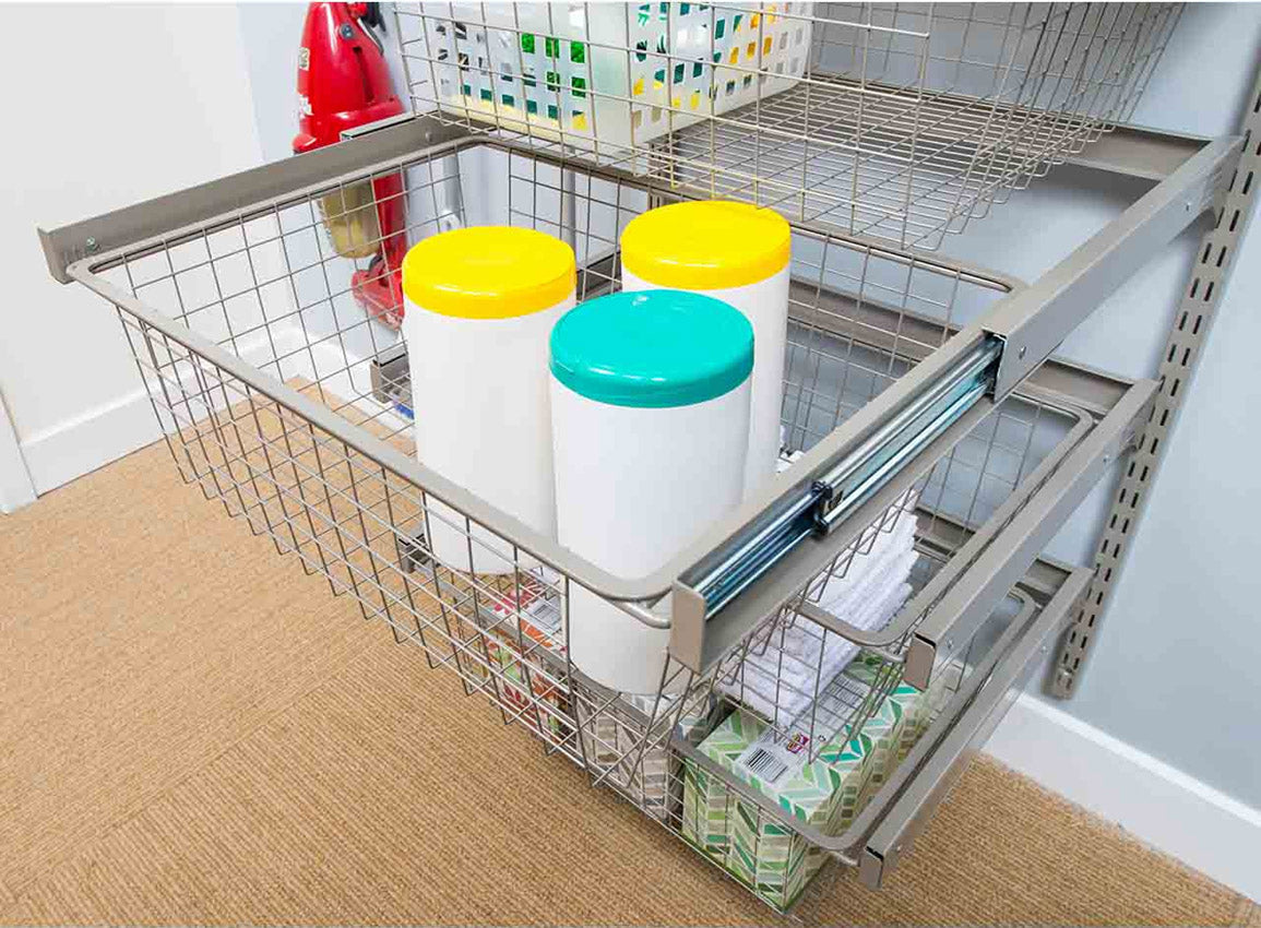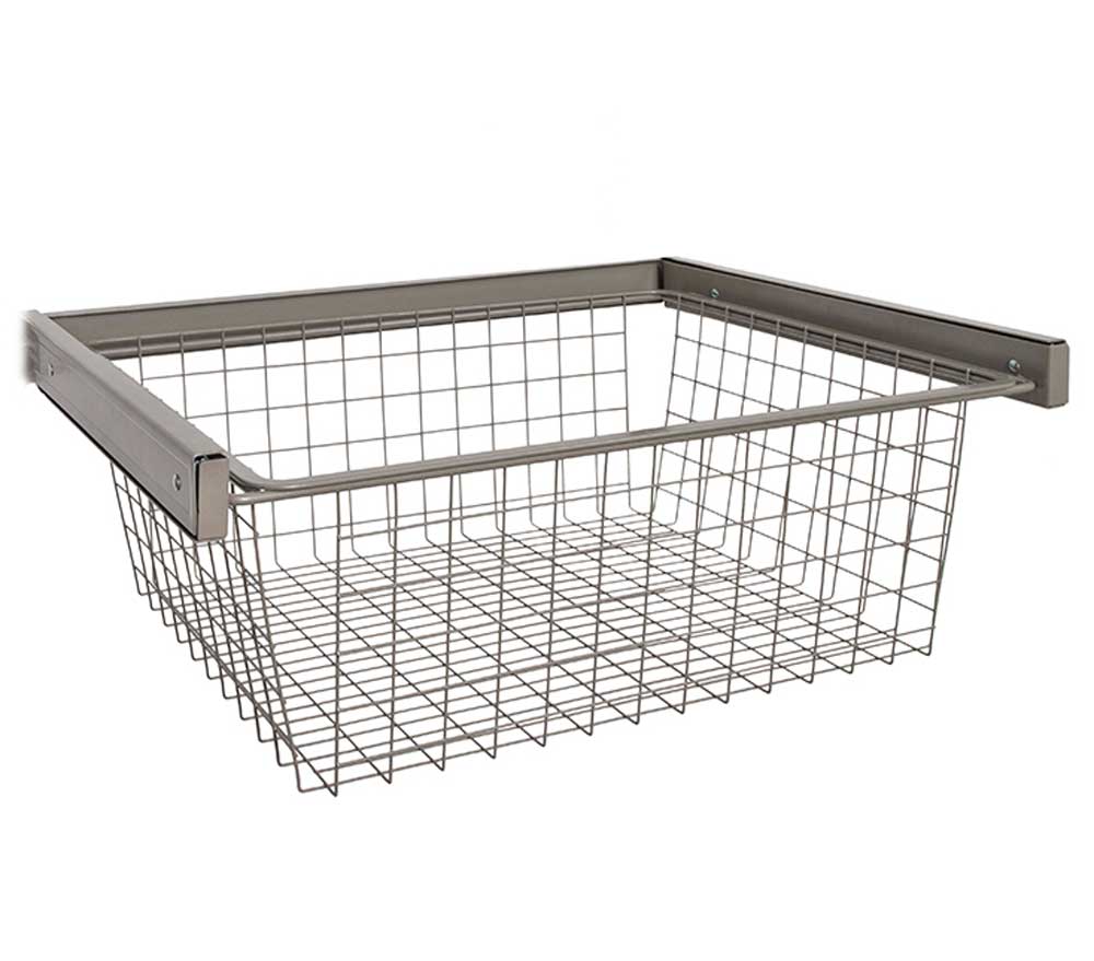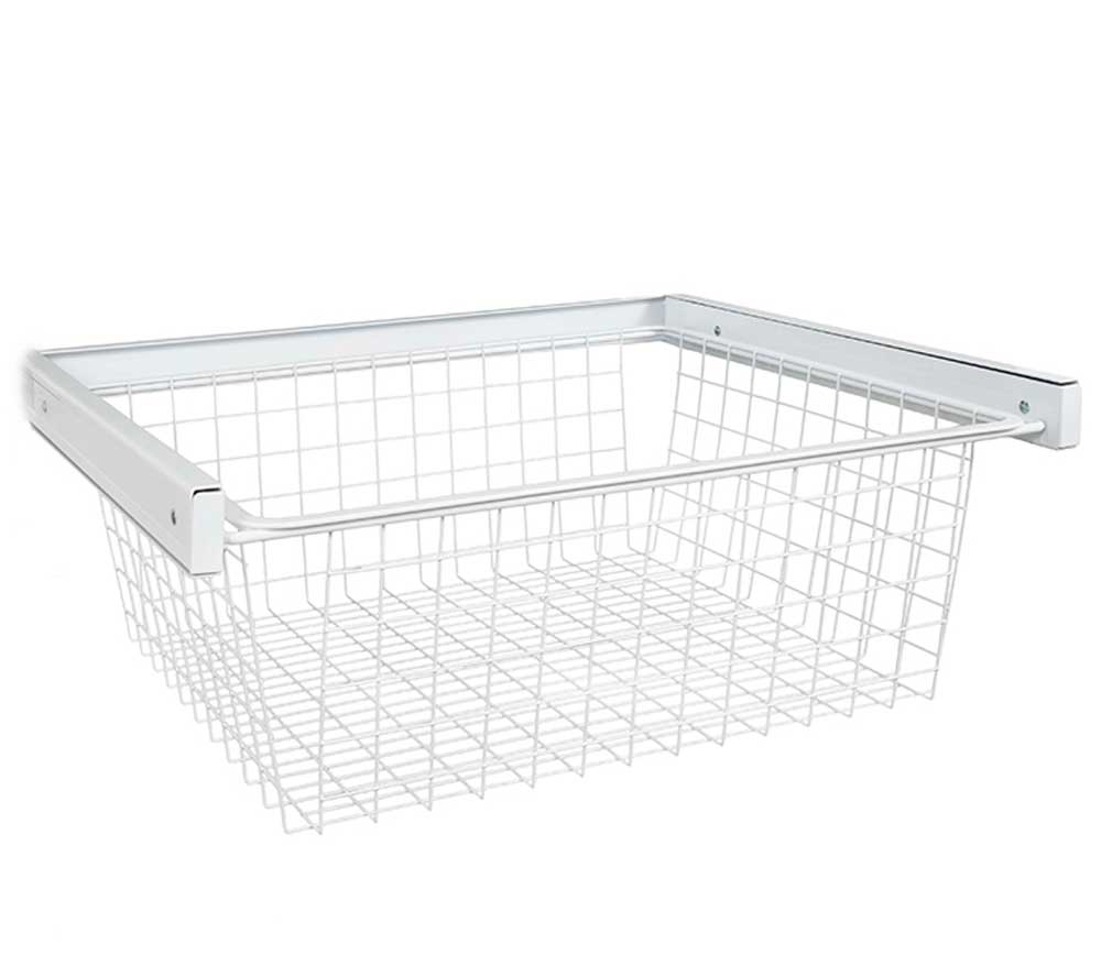 Add convenient pullout storage to your freedomRail closet system using the freedomRail Wire Basket. This storage basket features tool-free. snap-in assembly and a smooth-gliding design that allows you complete access to your stored items. The basket simply snaps into the uprights for easy storage. It can be stacked in multiples to build an in-closet dresser. or use singly. depending on your storage needs. It's great for storing folded sweaters. jeans and linens and also works well in a pantry or utility closet. The freedomRail Wire Basket comes in two attractive. epoxy-coated finishes to match your systems: white or nickel.