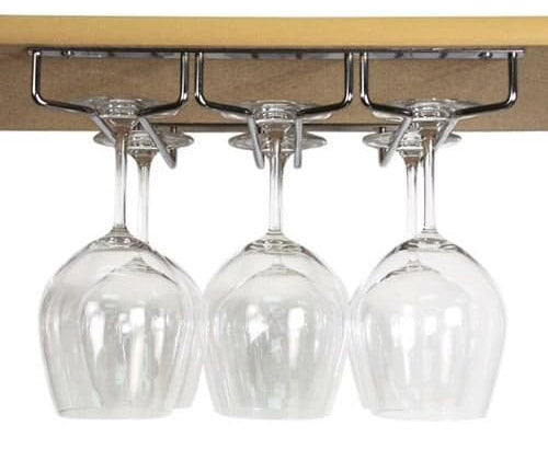 Use this Stemware Holder to keep your stemmed wine glasses out of harms way by hanging them on this heavy duty metal stemware rack. The chrome finish will complement a variety of different cabinet or bar area styles and colors. The chrome stemware holder can hold glasses up to 3.125 inches in diameter. The stemware holder is 10 inches long and can hold between 6-9 wine glasses. There are three rows total and all screws and pieces are included for easy installation.