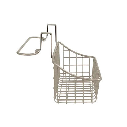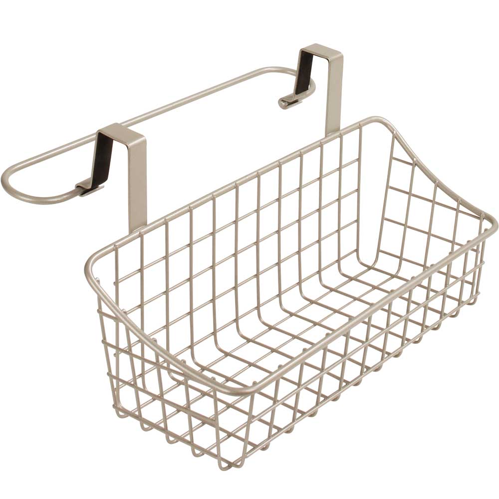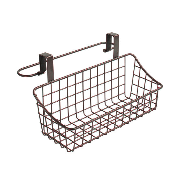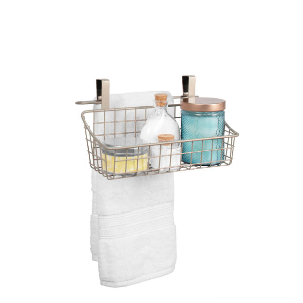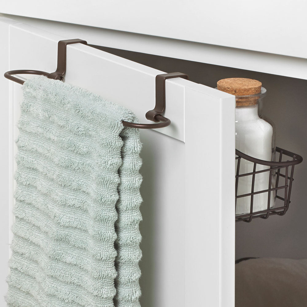 This cabinet door organizer features a towel bar on one side and a wire basket on the other. which provides plenty of storage and organization space. When you slide the brackets over the cabinet door. the towel rack rests on one side while the storage basket rests on the other. This towel bar and basket organizer is constructed from strong steel and finished in your choice of powder-coated finish.