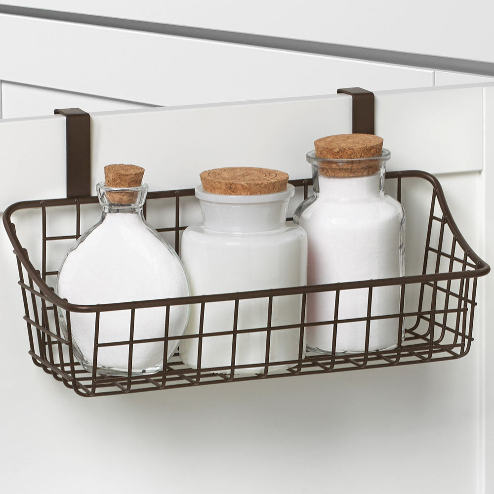 Add the Over Cabinet Door Basket with Towel Bar to your kitchen or bathroom cabinet to maximize the available storage space. Simply slide the brackets onto any standard sized cabinet door measuring 3/4 of an inch thick or less and it will hang securely in place. Absolutely no hardware or permanent installation is needed. making it easy to move around as desired. The inside of brackets are padded to protect the cabinet door from harm.