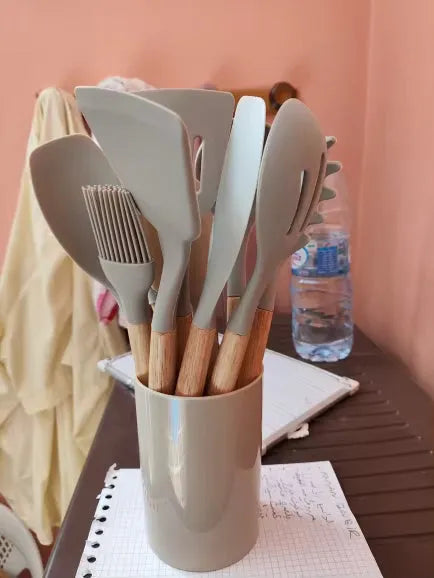 Our Silicone Kitchen Tools Set is meticulously crafted for those who love both cooking and style. The heat-resistant materials ensure that the tools won't warp or melt, while the non-stick surface makes turning and flipping foods a breeze. Their elegant wooden handles provide a comfortable grip and add a touch of sophistication to your kitchen decor. Whether you're a professional chef or a home cook, these utensils are designed to meet all your culinary needs with ease and elegance. A must-have addition for anyone looking to upgrade their kitchen experience.