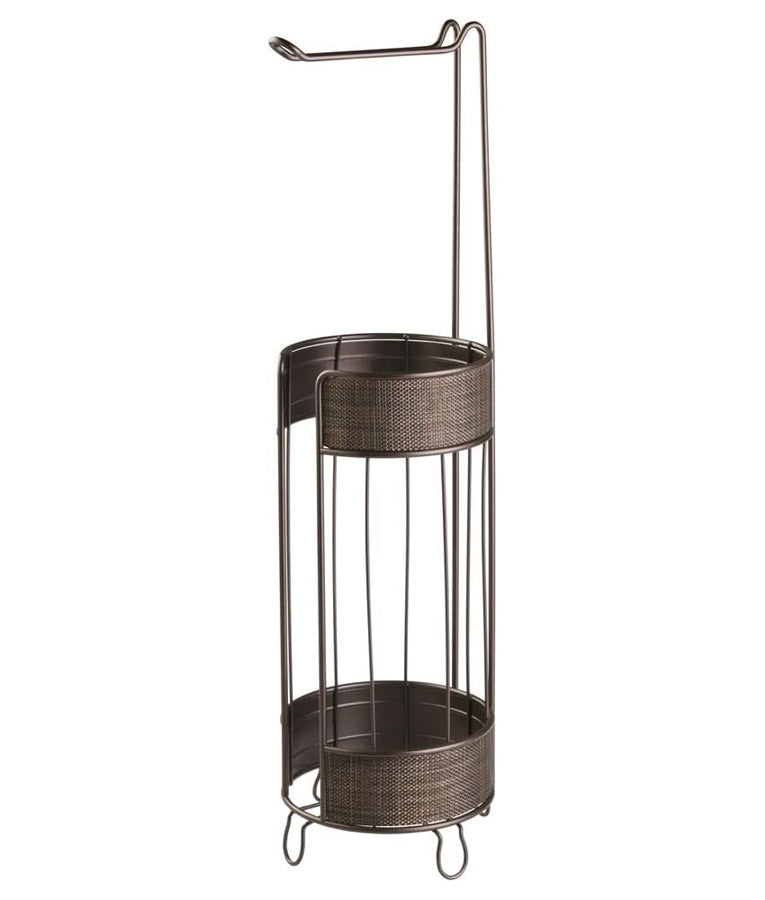 Hang and store up to three extra toilet paper rolls with this Toilet Paper Reserve Holder. This contemporary bathroom accessory complements any bathroom decor. With an elegant bronze finish and sturdy metal wire construction. this tissue holder is extremely durable. Four strong metal legs provide a sturdy base to prevent tipping. This reserve holder has a 6 inch diameter. which holds larger sized rolls.